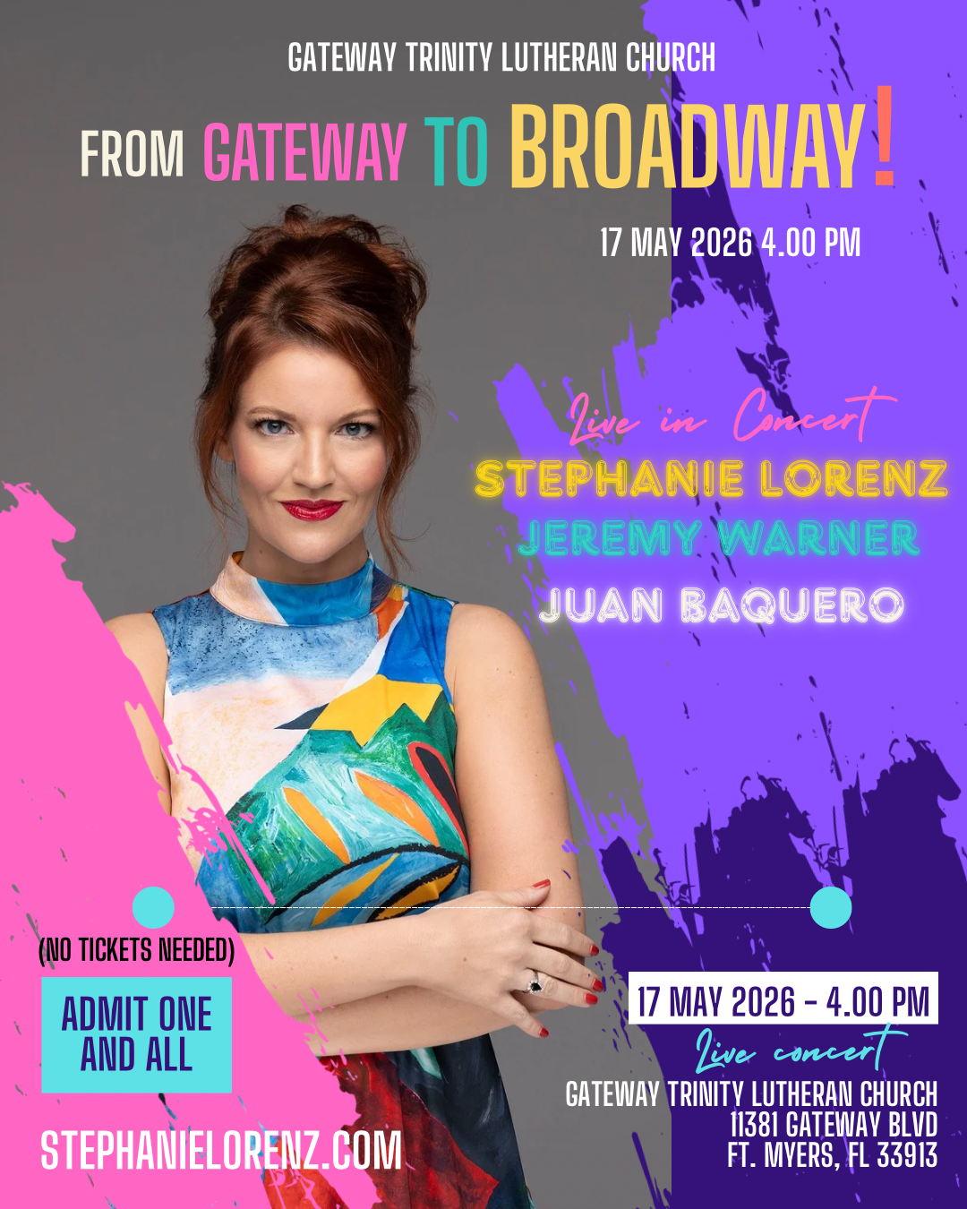 “FROM GATEWAY TO BROADWAY!” promises to be an unforgettable show packed full with our favorite songs and duets from sacred & opera to cabaret & Broadway. German American Soprano Stephanie Lorenz and talented pianist Juan Baquero perform together often but this trio is only complete with the special addition of the Gateway Trinity Lutheran Church Director of Worship and Music, and Baritone, Jeremy Warner!